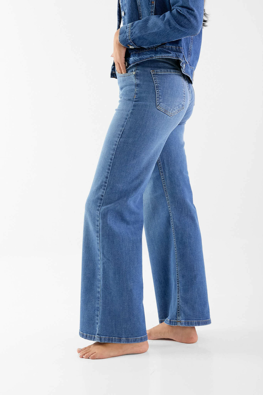 Un wide leg de tiro alto que aporta mucha onda y comodidad. Color lavado azul con desgastes láser y terminación con ruedo.