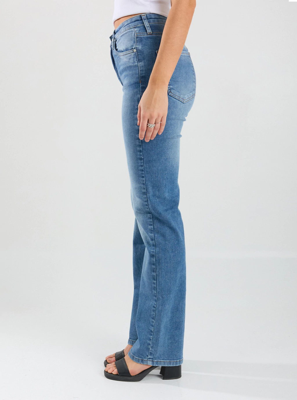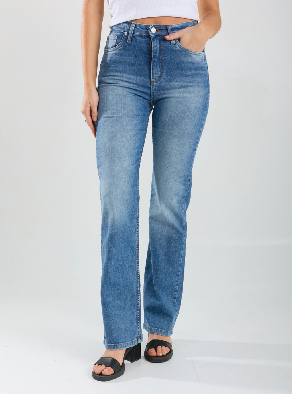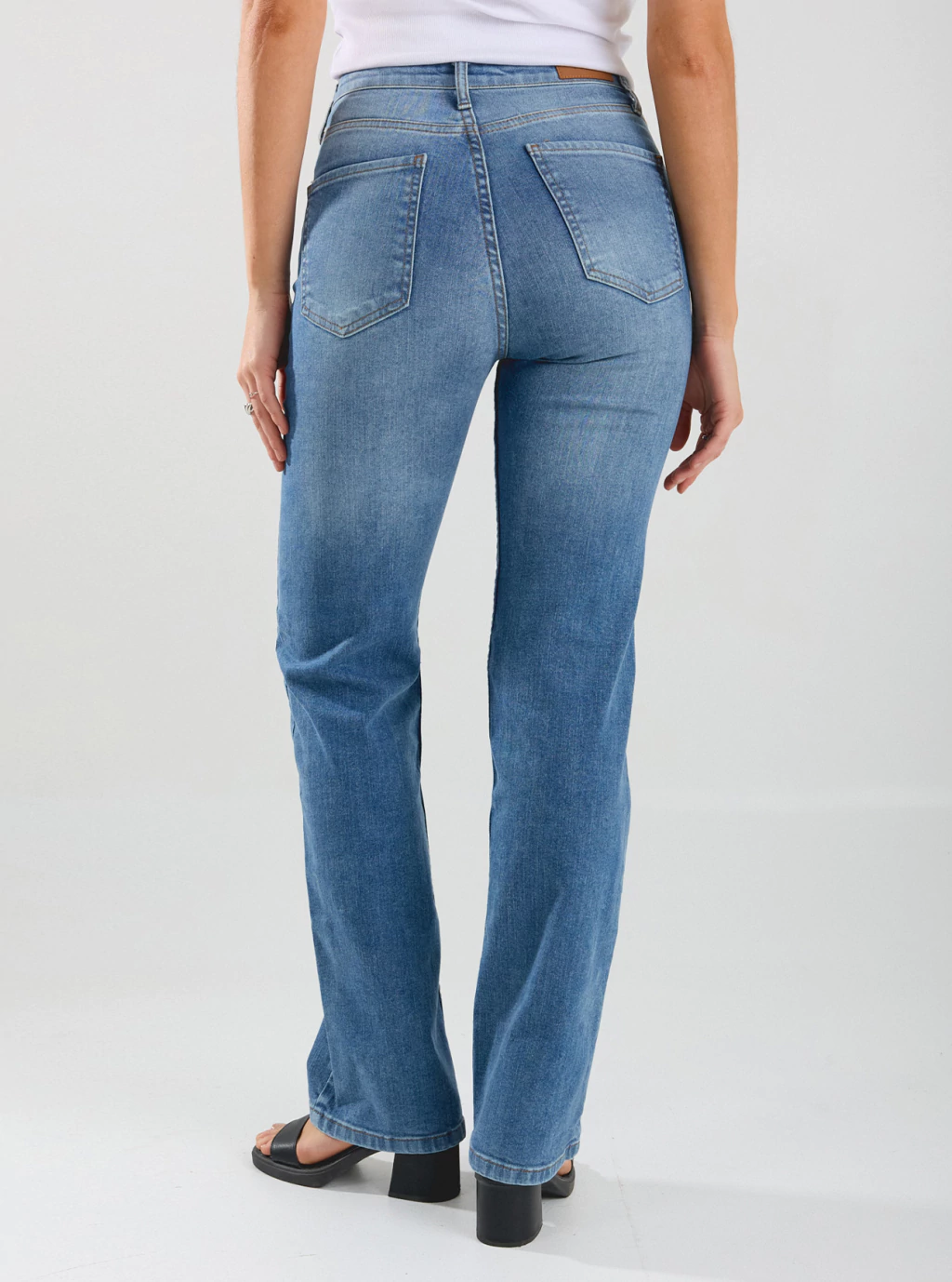 Un básico imprescindible con tiro alto y pierna slim que llega justo por debajo del tobillo. Su lavado azul gastado gastado, combinado con bigotes láser y detalles localizados, aporta un estilo único y moderno.