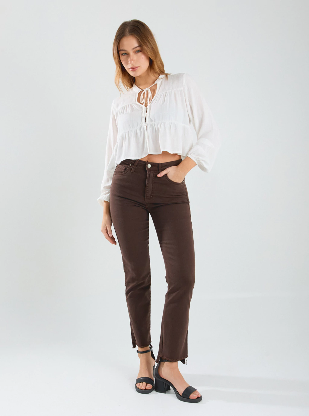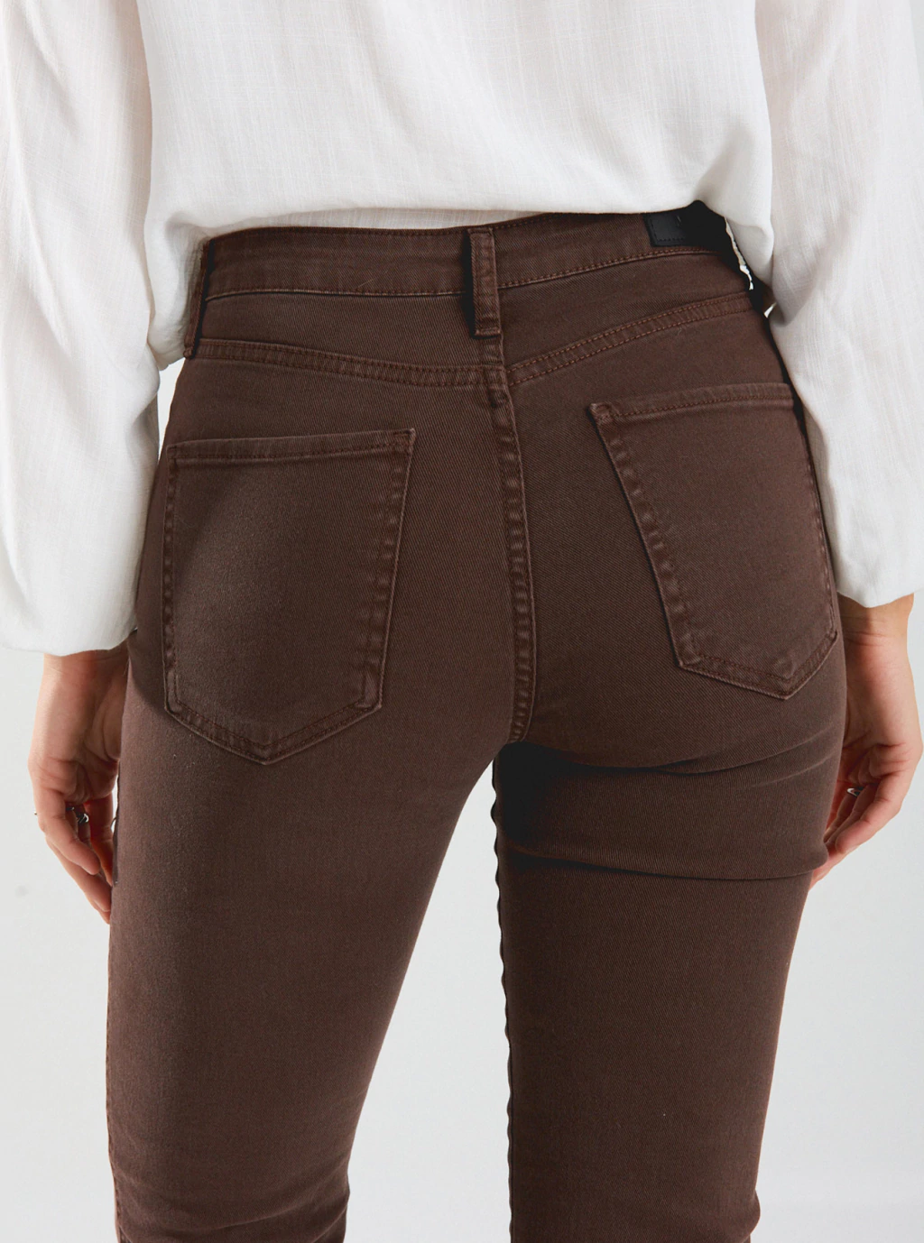 Jean de tiro alto y pierna slim que realza tu silueta con elegancia. Su bota escalonada y ruedo desflecado aportan un toque moderno y desenfadado. Color marroón chocolate, su tejido elastizado (98% algodón, 2% elastano) garantiza comodidad y un ajuste perfecto.