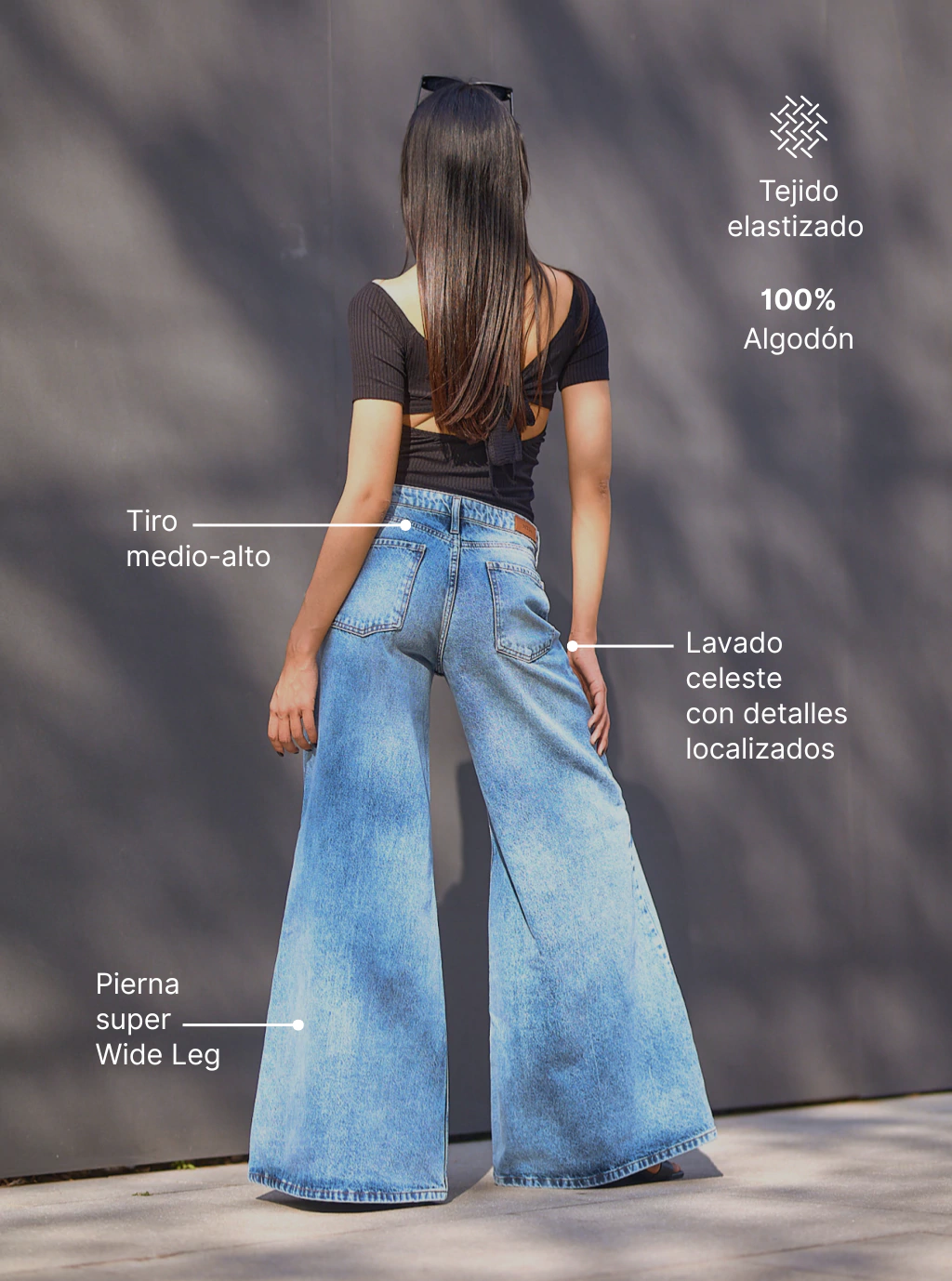 Una prenda que redefine la elegancia y comodidad. Con un tiro medio-alto y un diseño de pierna super wide leg, este jean confeccionado en denim rígido es perfecto para cualquier ocasión.